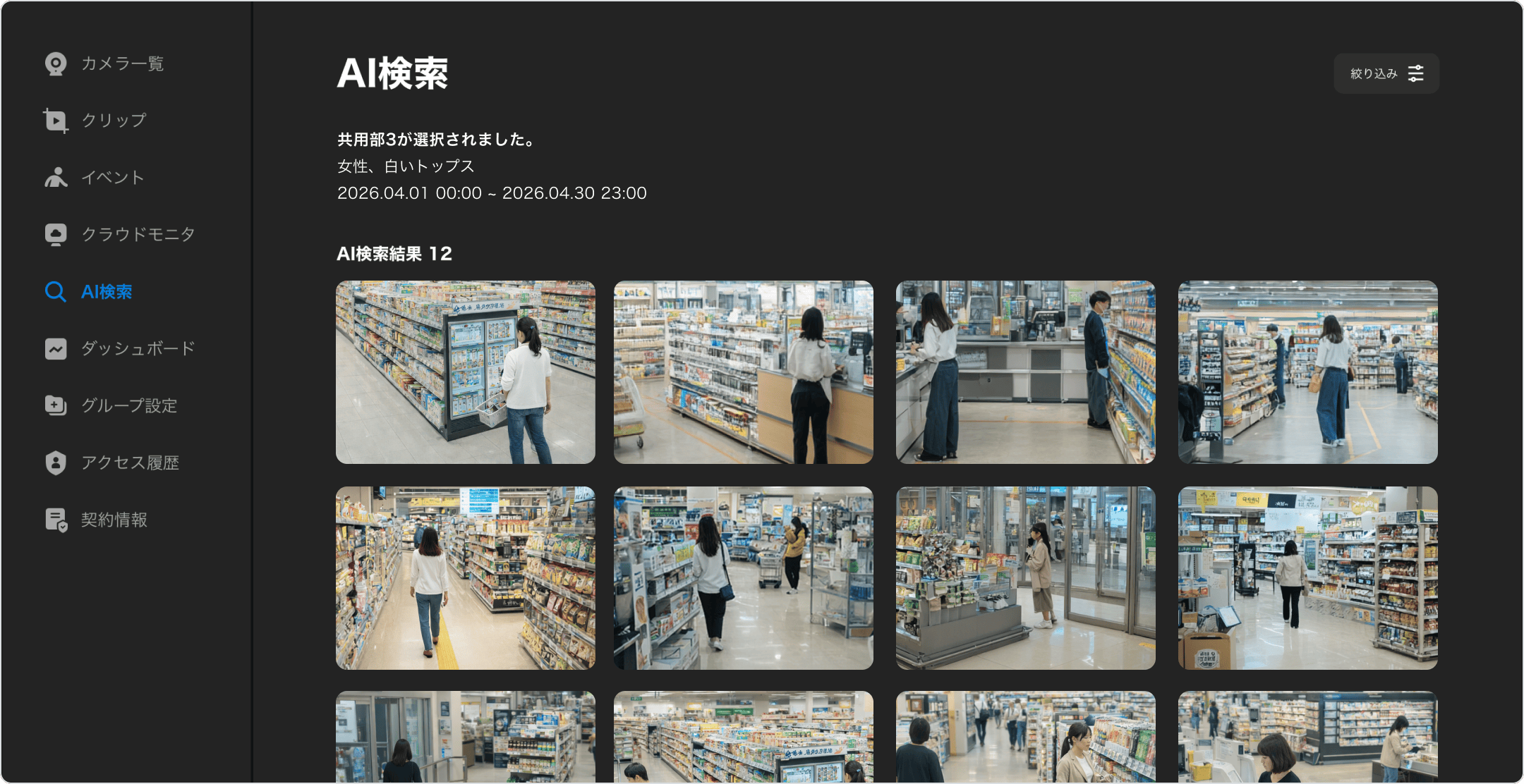 1台の端末から複数のカメラを一括管理できます。オプション機能のクラウドモニターを利用すれば、最大12台のカメラ映像を同時にライブ視聴することもできます。本社から複数店舗の様子を遠隔監視したり、警備室のモニターで複数箇所の映像を同時チェックする運用にも対応します。